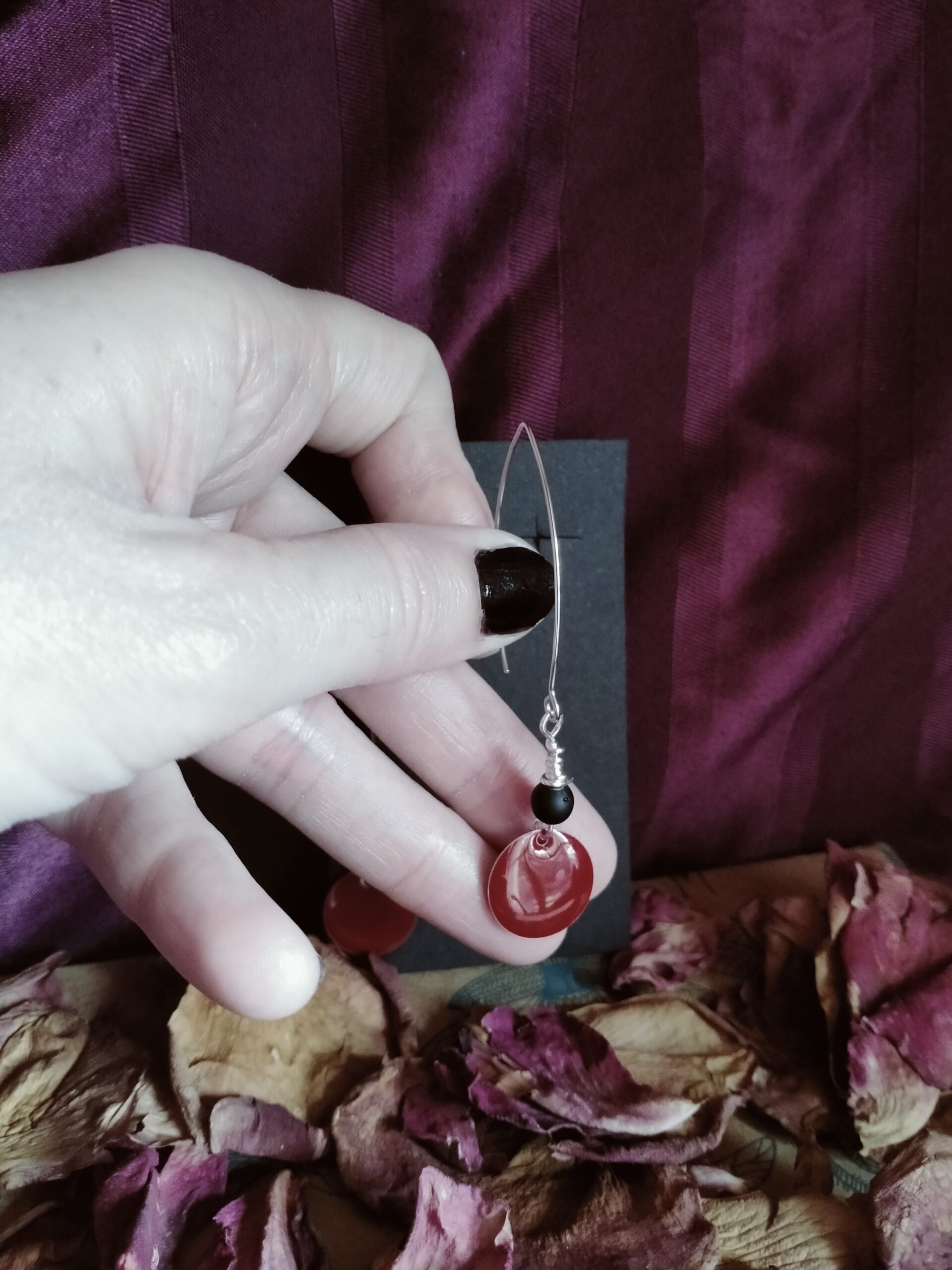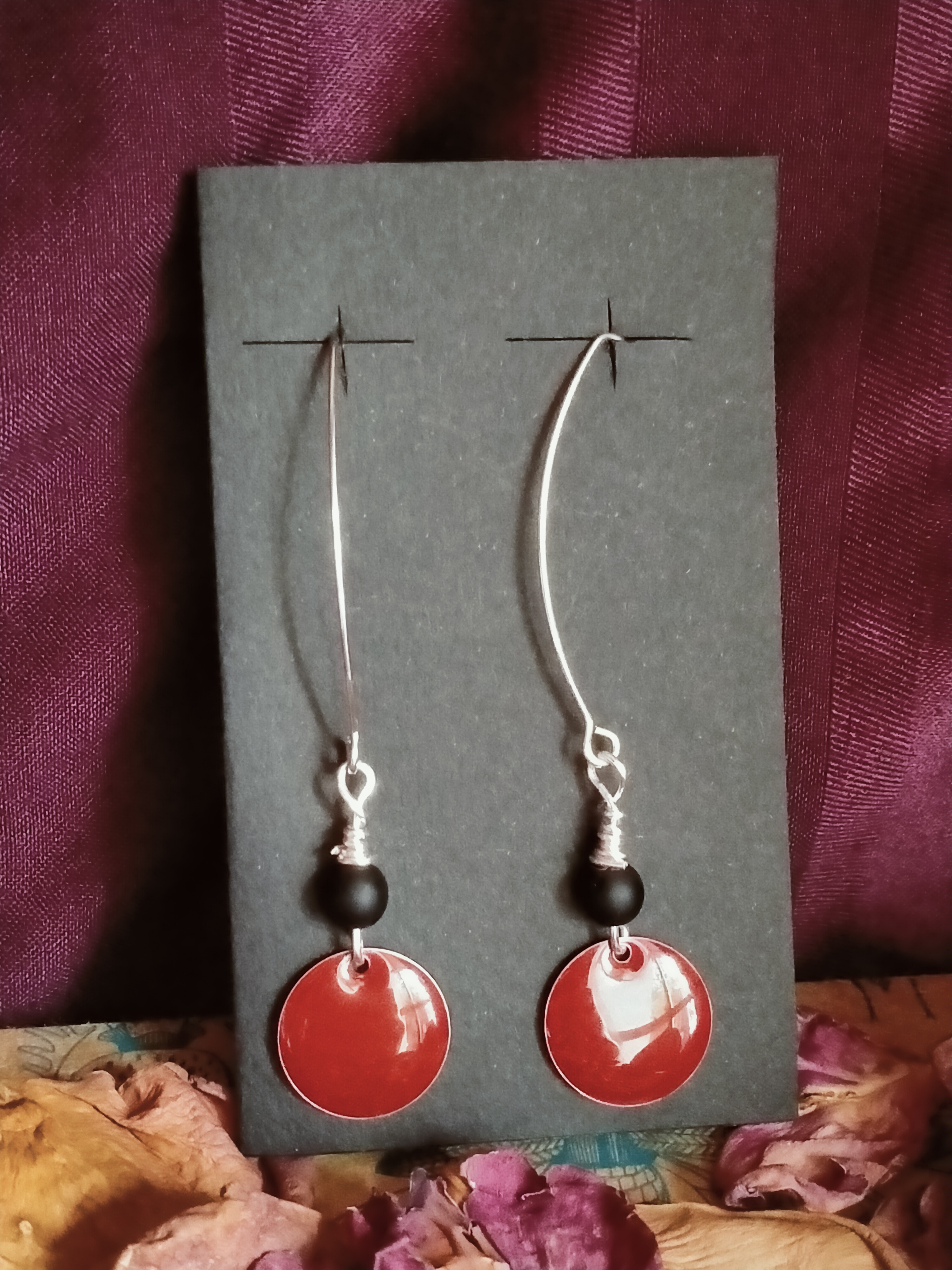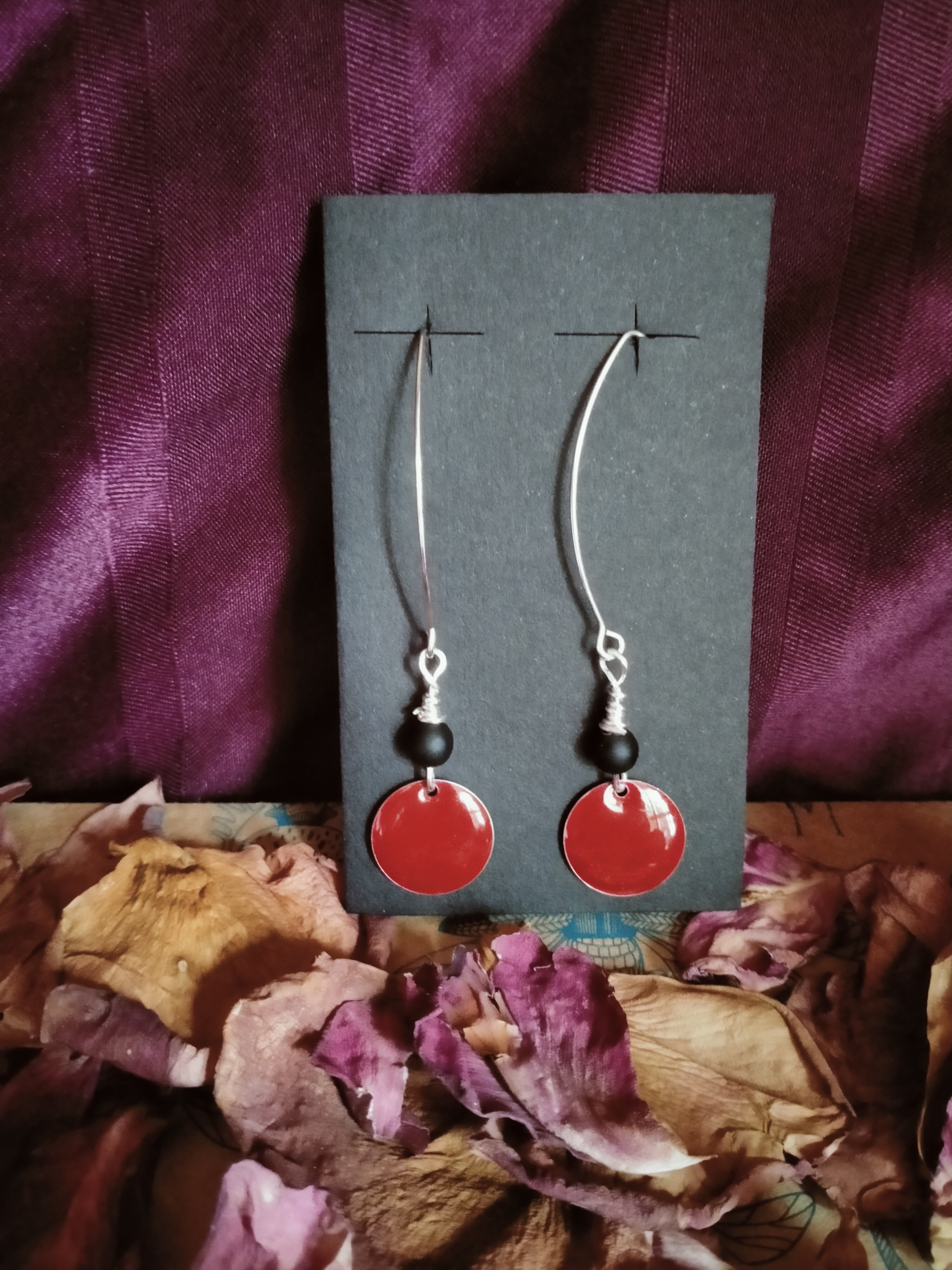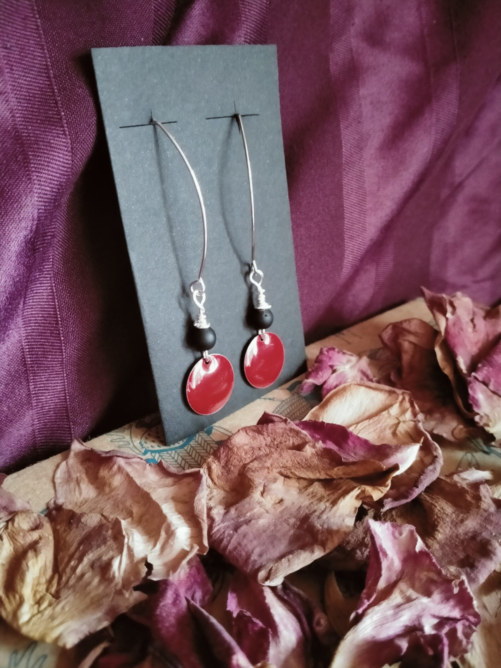 Paire de boucles d’oreilles avec une breloque moyen format, une perle en verre et un fil de cuivre ou d’acier inoxydable. L’attache est réalisée également par mes soins.